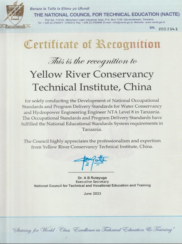 近日,由我校水利工程学院水利水电工程技术专业团队独立承担研制开发的坦桑尼亚水利水电工程工程师NTA8级(最高等级)国家职业标准,通过坦桑尼亚国家职业教育委员会审核,获得认证,正式纳入坦桑尼亚国家职业教育体系。