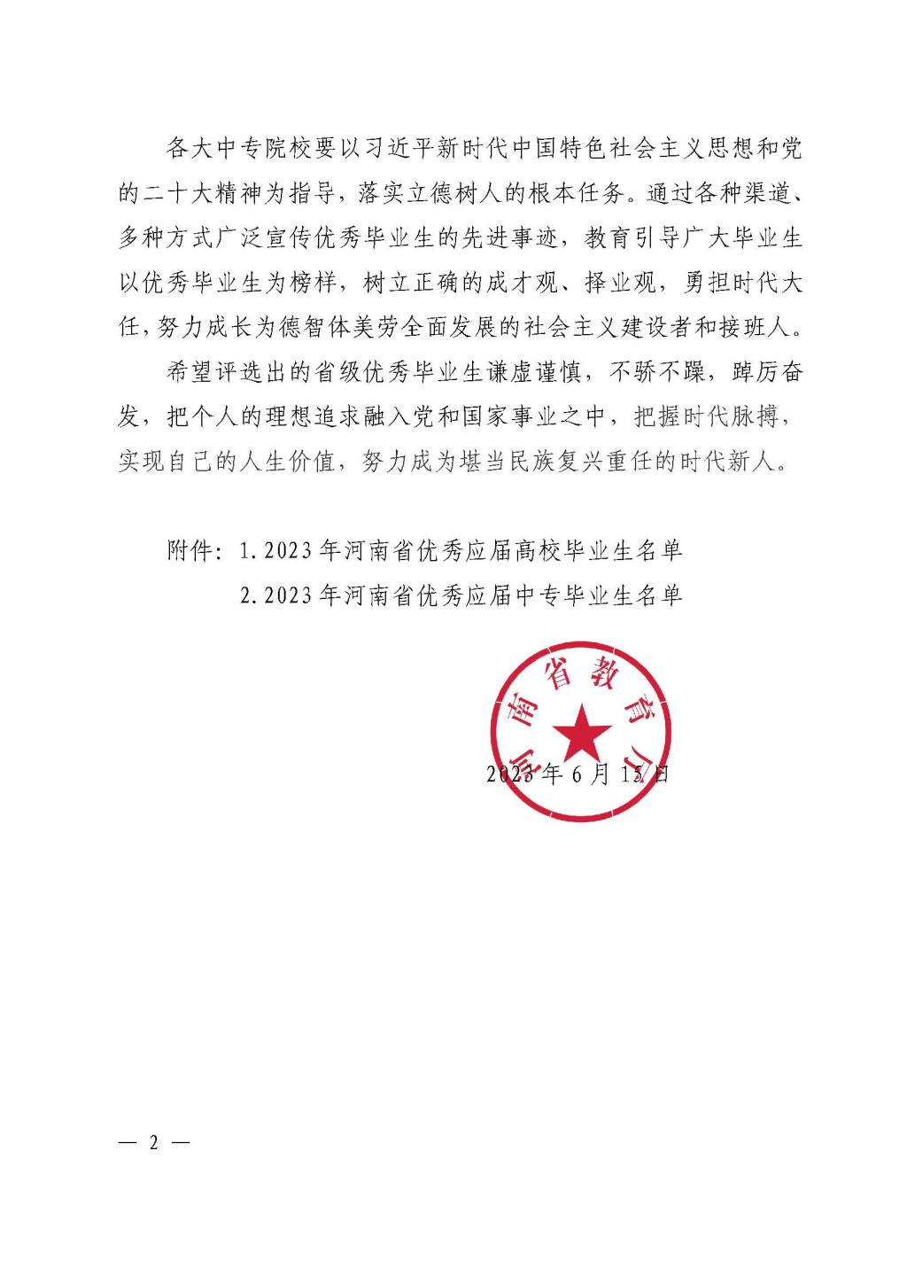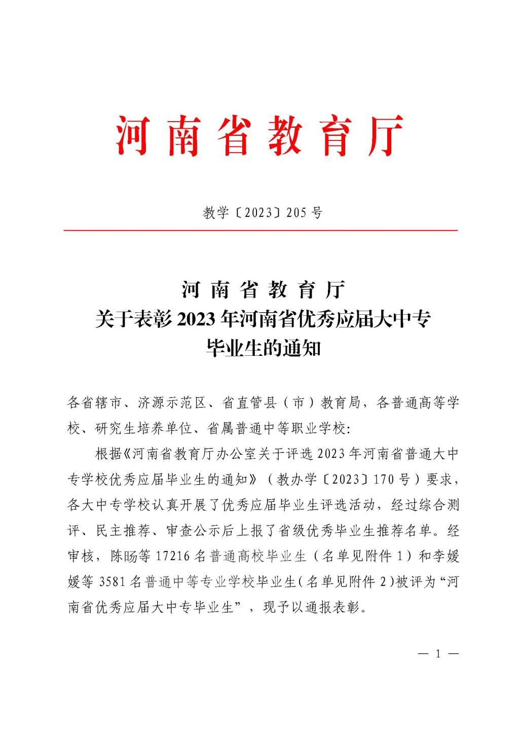 近日,河南省教育厅发布《关于表彰2023年河南省优秀应届大中专毕业生的通知》(教学〔2023〕205号),我校孙羡博等117名同学荣获2023年河南省优秀应届大中专毕业生。
