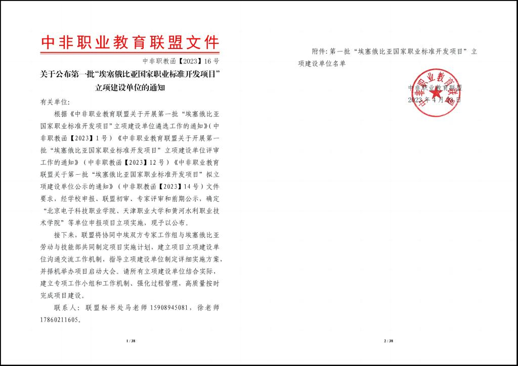 近日,中非职业教育联盟发布《关于公布第一批“埃塞俄比亚国家职业标准开发项目”立项建设单位的通知》(中非职教函【2023】16号),我校被确定为立项建设单位,将开展“大坝安全与集水操作技术员/工程师(V级)”“灌溉与排水系统技术员/工程师(V级)”“地籍勘测与制图技术员/工程师(V级)”和“固体废物管理技术员/工程师(V级)”四个项目的埃塞俄比亚国家职业标准开发。
