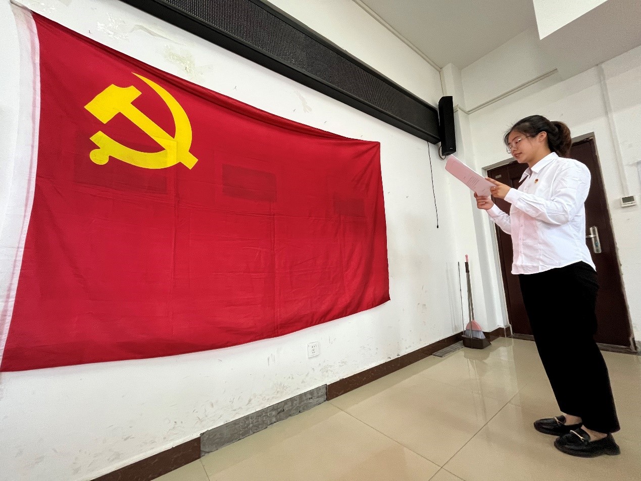 预备党员华玲面向党旗宣读转正申请