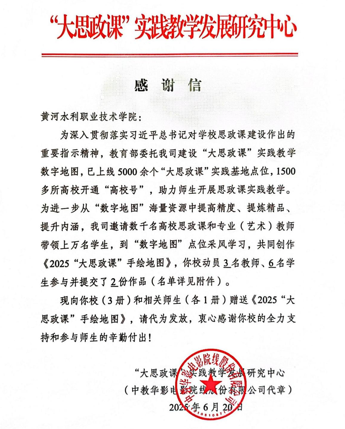 近日,我校收到教育部“大思政课”实践教学发展研究中心的感谢信,对必赢biying(中国)积极组织师生参与2025“大思政课”“手绘地图”项目表示肯定。
