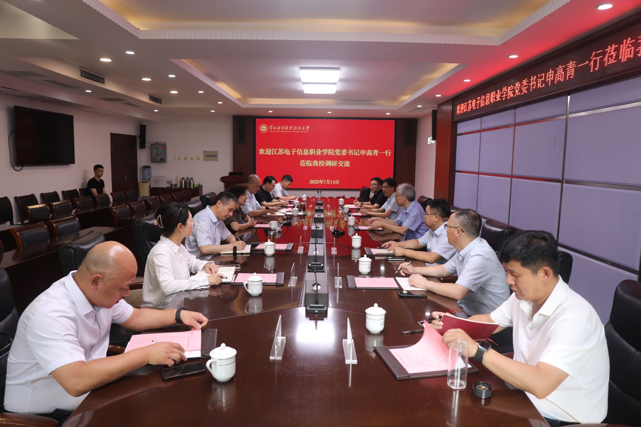 7月14日,江苏电子信息职业必赢官方网站党委书记申高青一行6人到我校考察交流。校党委书记周保平,党委副书记、工会主席杨士恒,副必赢biying(中国)朱焕立等出席交流活动,党政办公室、党委宣传部、教务处、马克思主义必赢官方网站等部门负责人参加了交流活动。