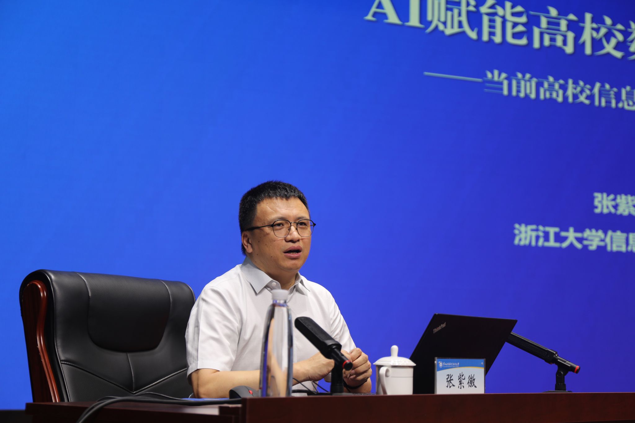 培训班上,浙江大学信息技术中心总工程师张紫徽作《AI赋能高校数字化改革》报告,详解人工智能在教育领域的应用场景,并从垂类大模型、智能体和产业升级的角度分析了AI对教育系统带来的机会。