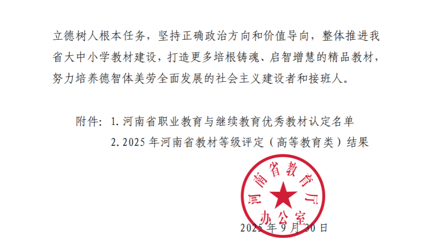 根据《河南省教育厅办公室关于开展河南省教材等级评定暨第二届全国教材建设奖全国优秀教材推荐工作的通知》(教办思政〔2025〕184号)精神,省委教育工委、省教育厅组织开展了全省教材等级评定工作,评选出职业教育与继续教育类优秀教材150项,我校丁秀英,张梦宇教授主编的《水闸设计与施工(第四版)》等9部教材入选并获奖,其中特等奖1部,一等奖1部,二等奖7部。
