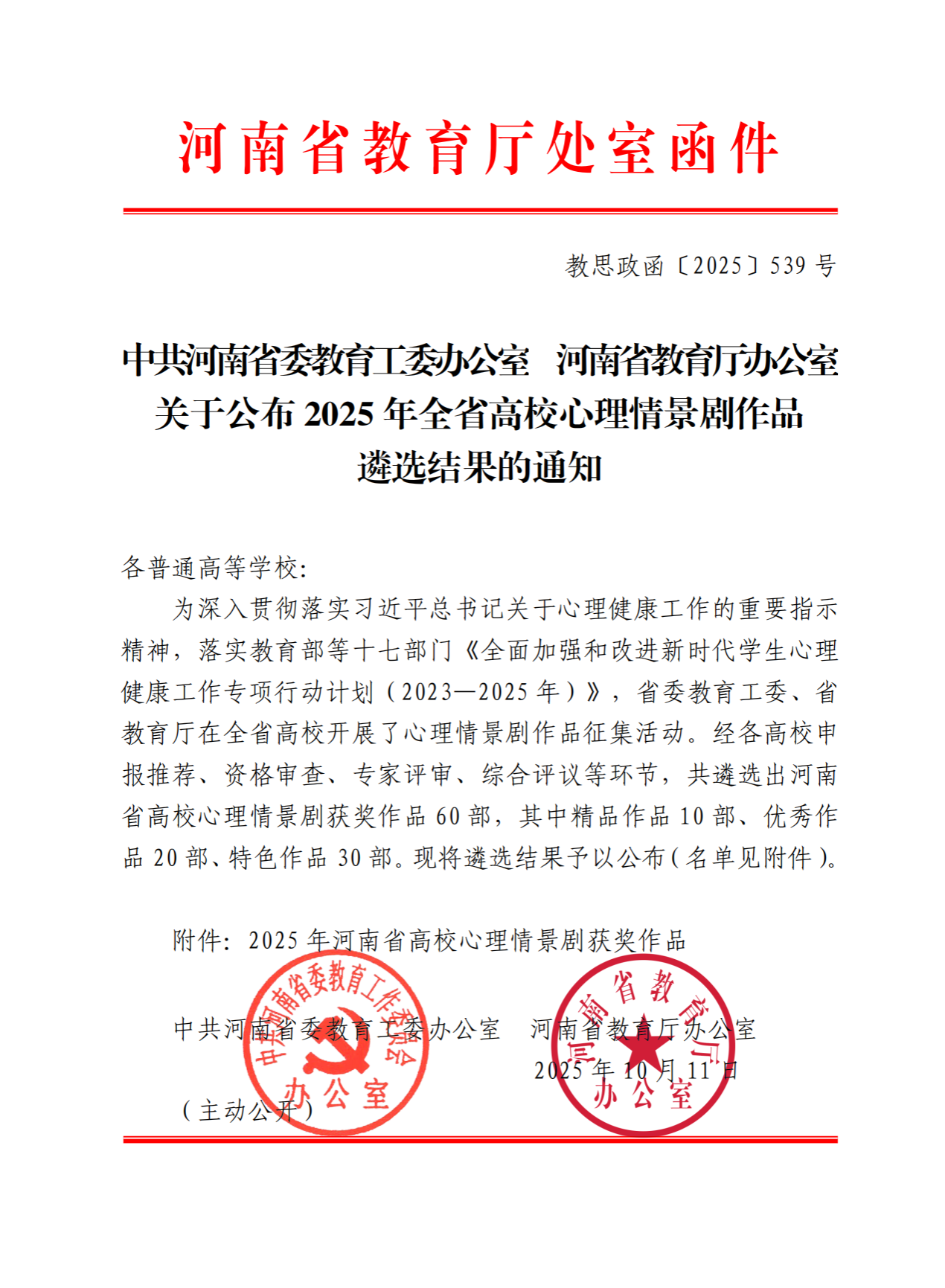 今日,省委教育工委、省教育厅印发《关于开展2025年全省高校心理情景剧作品征集展演活动的通知》(教思政函〔2025〕136号),我校原创心理情景剧《破网重生》获评河南省高校心理情景剧“特色”作品。