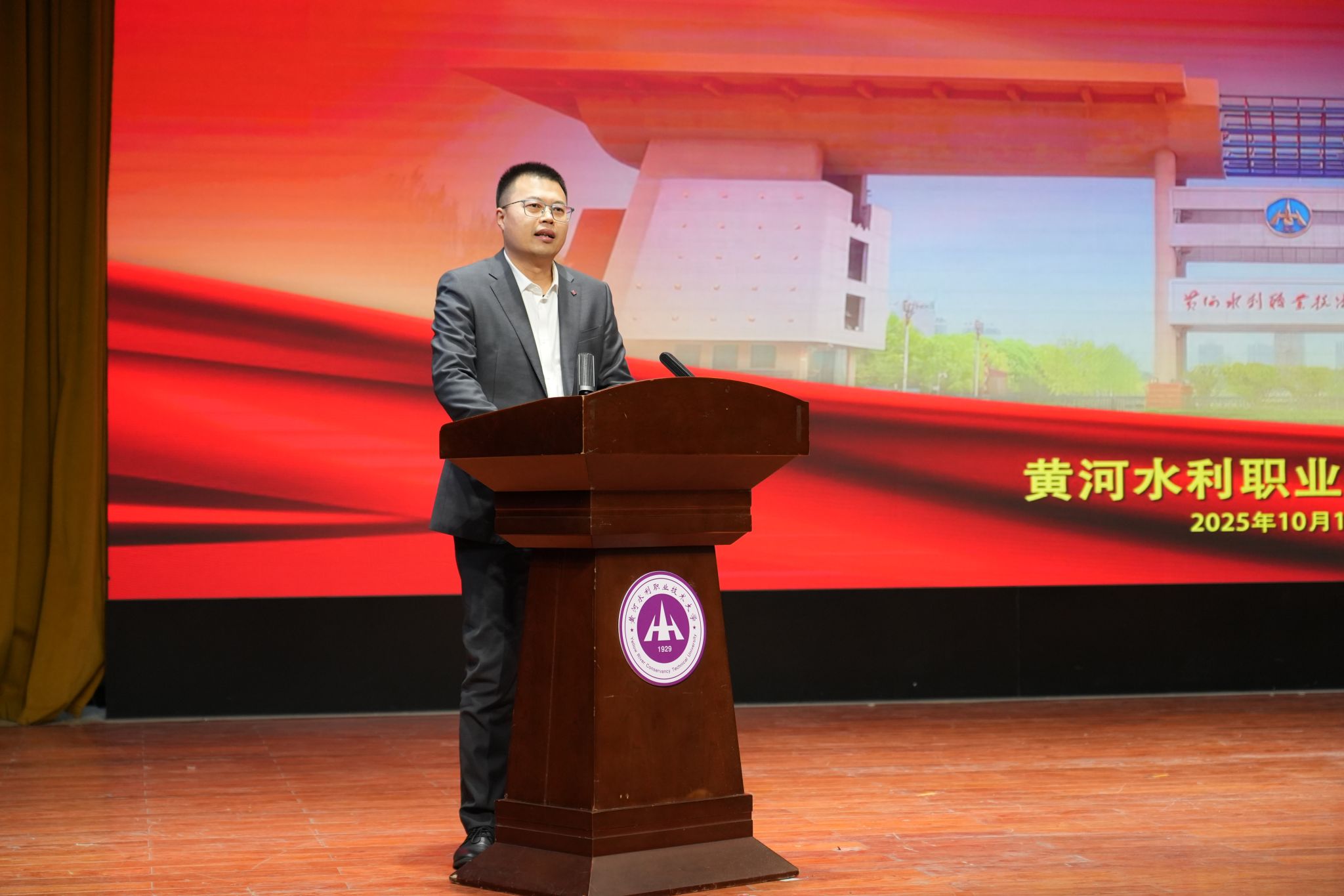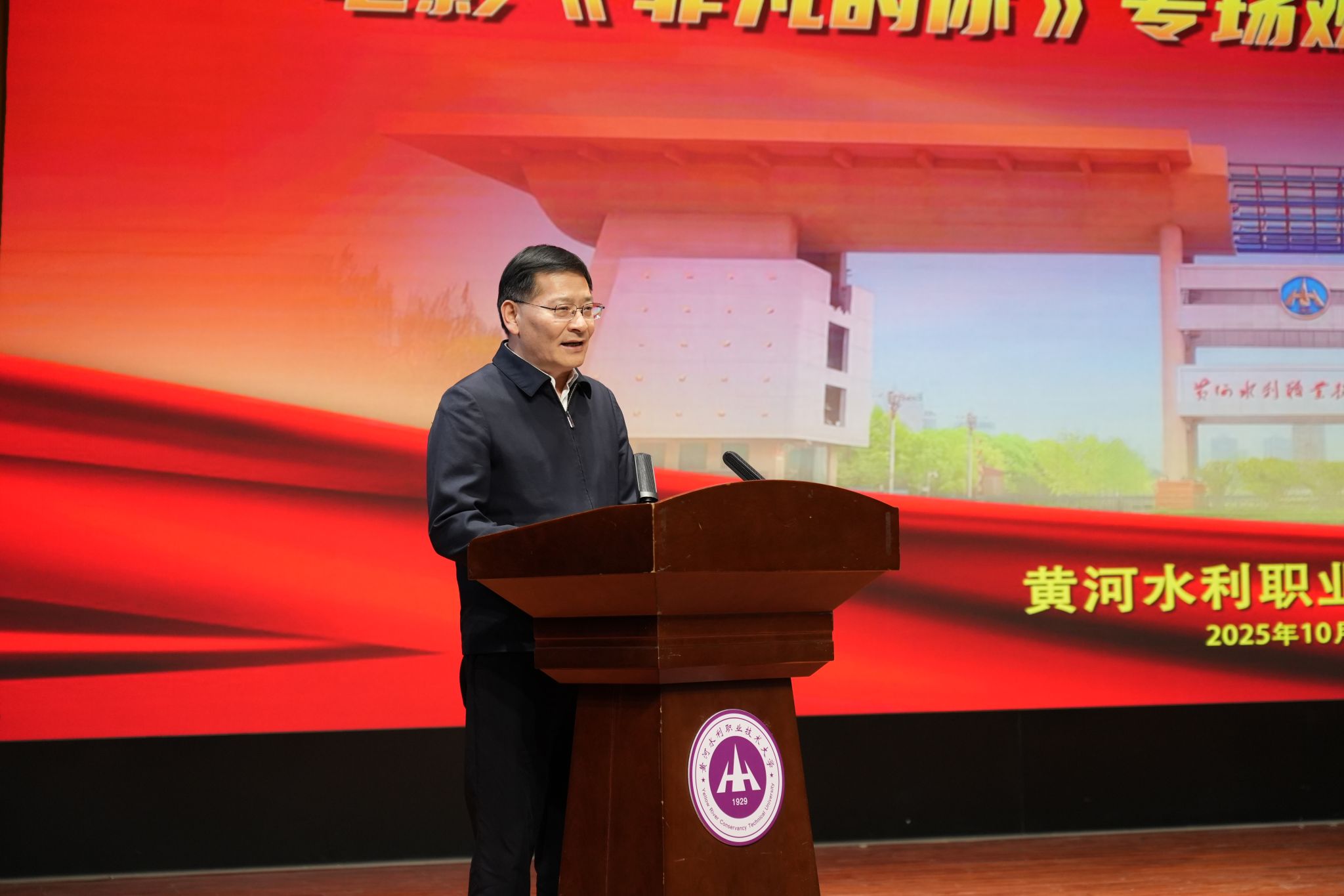 刘林亚致辞。他指出,省教育厅始终将“强化思政引领、推动产教融合、培育特色名校”作为工作重点,持续为高校高质量发展保驾护航。电影《非凡的你》以红旗渠设计师、黄河水利职业技术大学杰出校友吴祖泰为原型,生动诠释了红旗渠精神,为全省高校开展红色思政教育提供了一部鲜活的“教材”。希望黄河水利职业技术大学以本次活动为契机,进一步把红旗渠精神融入办学治校、教书育人全过程,培养更多像吴祖泰一样“有理想、敢担当、能吃苦、肯奋斗”的新时代水利人;希望全省高校以《非凡的你》为范例,探索更多“艺术 + 思政”“行业+育人”新路径,让思政育人更有温度、更接地气、更入人心;也希望青年学子们从影片中汲取“不认命、不服输”的力量,把个人理想融入国家发展大局,在技能报国、强国建设的征程中,书写属于自己的“非凡”篇章。