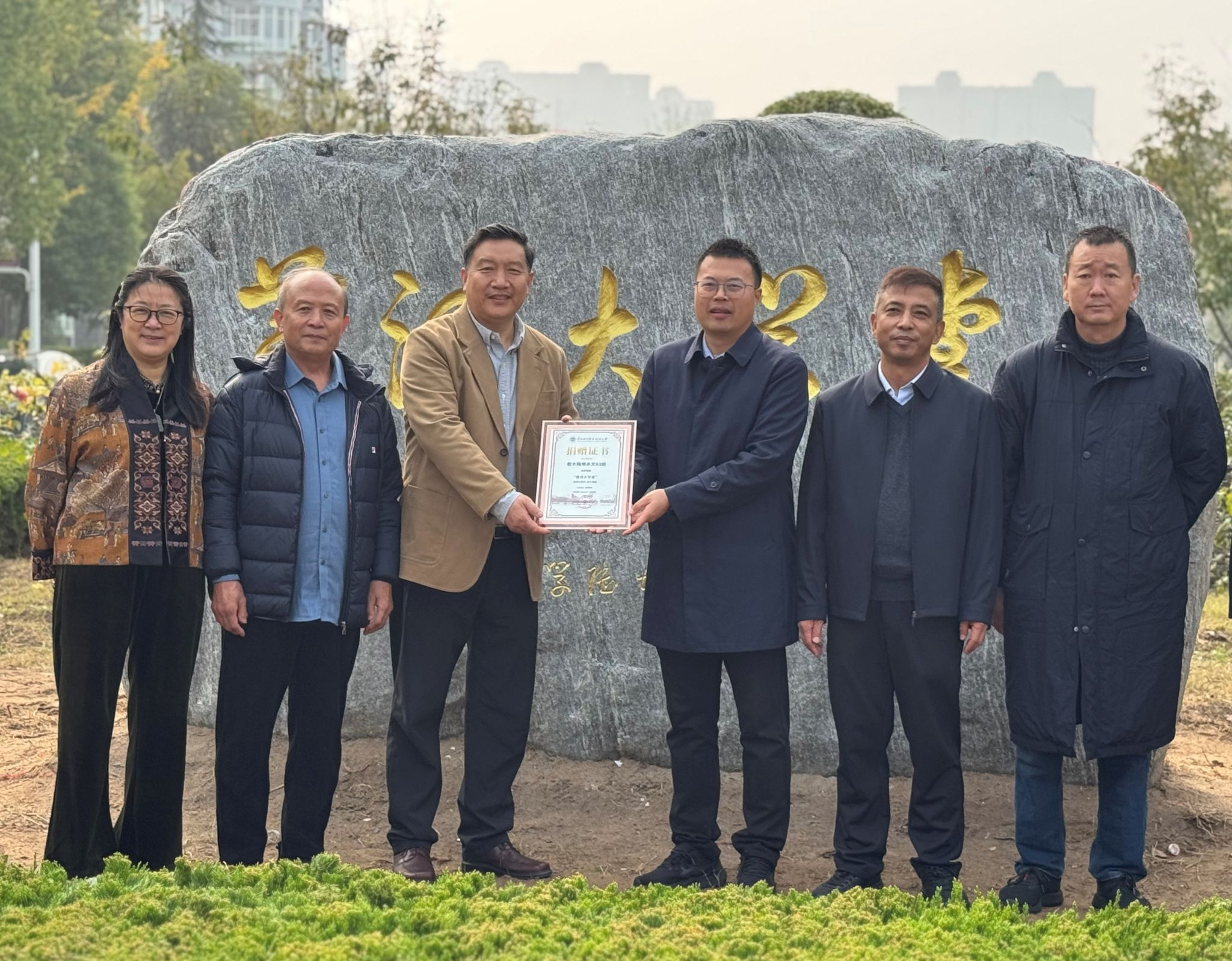 在捐赠仪式上,校友代表、原水利部黄河水利委员会水调局局长刘钢介绍了捐赠背景及意义,校友以捐赠“黄河大学堂”景观石的方式,表达了对母校培养的感恩之情和对未来发展的美好祝愿。随后,校领导与校友代表共同为景观石揭幕,胡昊向校友代表颁发捐赠证书。