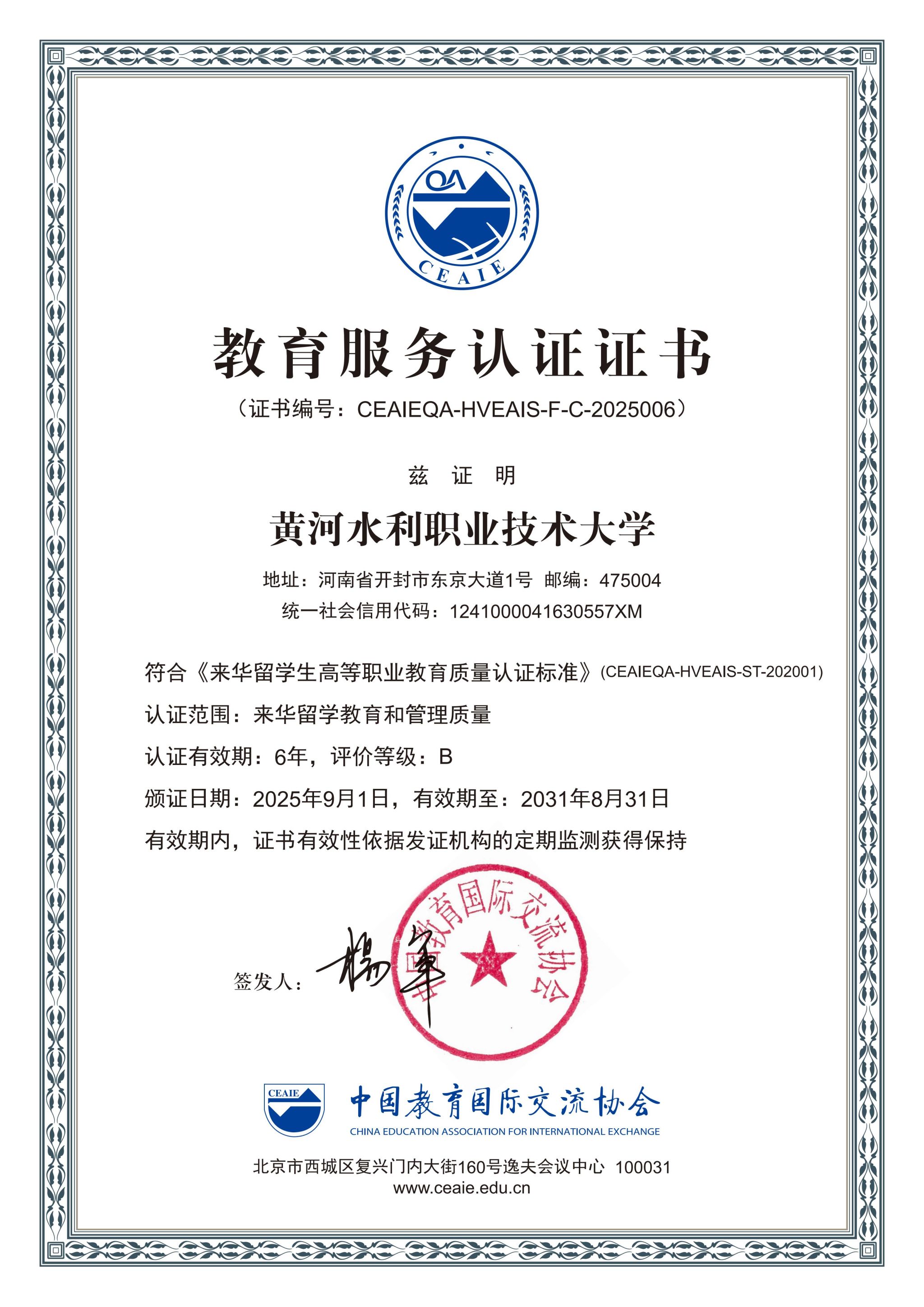 10月30日,在第26届中国国际教育年会上,中国教育国际交流协会发布了“2025年度来华留学生高等职业教育质量认证”结果,我校取得了B级的优异成绩及6年认证有效期。中国教育国际交流协会会长刘利民向高校代表颁发《教育服务认证证书》,必赢biying(中国)胡昊代表必赢biying(中国)接受颁证。