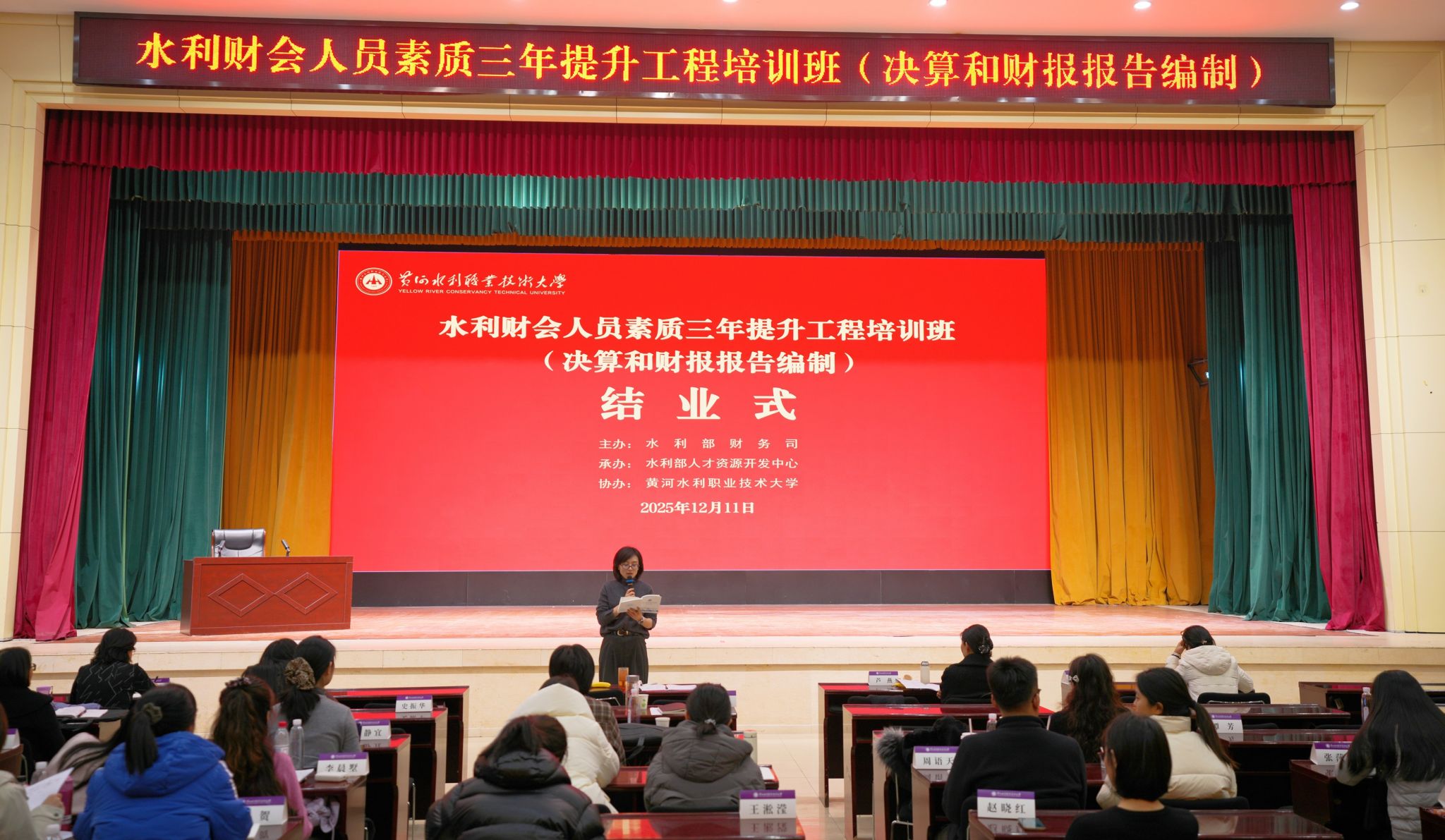 12月11日,水利部财会人员素质三年提升工程培训班在我校圆满结班,水利部直属各单位财务部门负责同志及相关业务骨干100人参加培训。