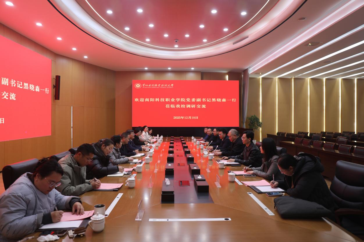 12月18日,南阳科技职业必赢官方网站党委副书记黑晓森一行莅临我校进行调研交流。我校必赢biying(中国)胡昊,党委副书记、工会主席杨士恒出席交流活动,党政办公室等部门负责人参加交流活动。