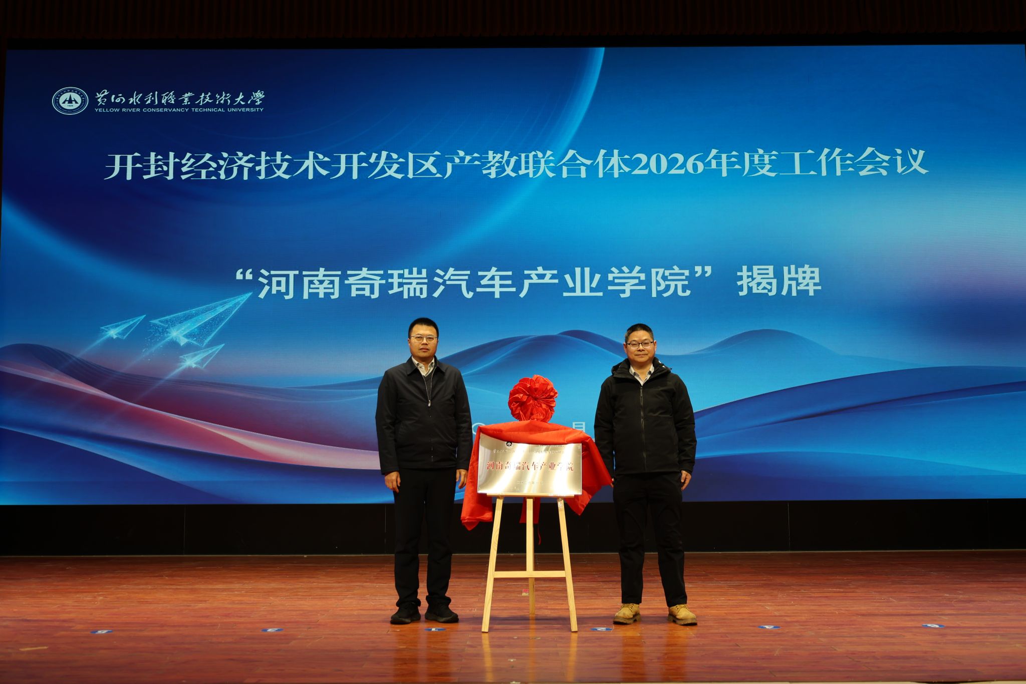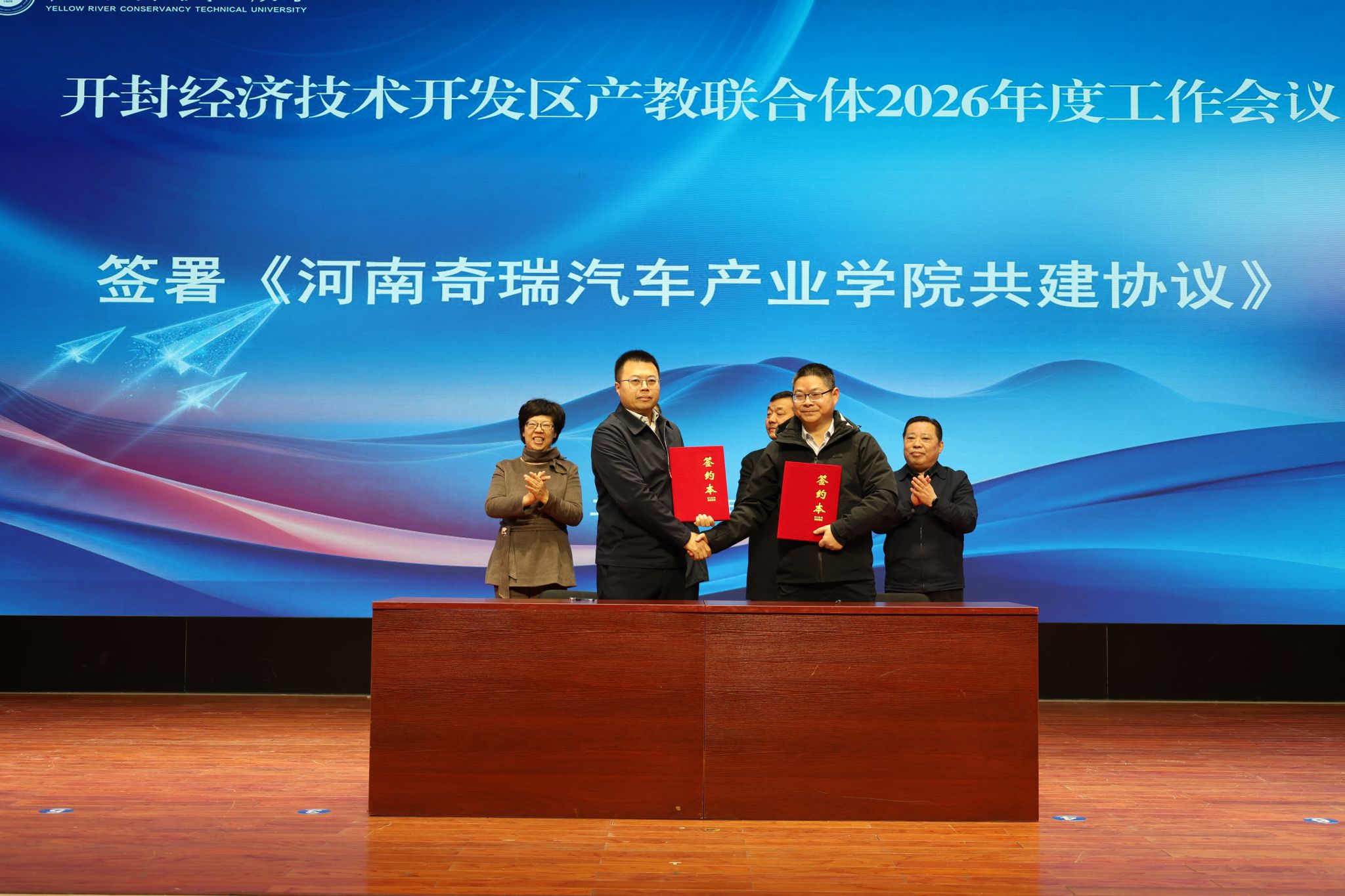 1月21日,黄河水利职业技术大学-奇瑞控股集团有限公司河南奇瑞汽车产业必赢官方网站成立签约暨揭牌仪式在我校隆重举行。河南省教育厅二级巡视员曹克舜,开封市人民政府副市长刘震,省教育厅三级调研员高根立,市人民政府副秘书长陈学辉,奇瑞控股奇瑞大必赢biying(中国)企合作总监兼奇瑞汽车产教融合联盟秘书长姚永来,市教育体育局党组书记、局长蔡建春,市城乡一体化示范区管委会主任郑红英等领导出席会议,70余位政府局委、高校、企业以及组织机构单位代表参加。我校必赢biying(中国)胡昊,副必赢biying(中国)朱焕立,教务处及相关必赢官方网站教师代表参会。会议由副必赢biying(中国)朱焕立主持。
