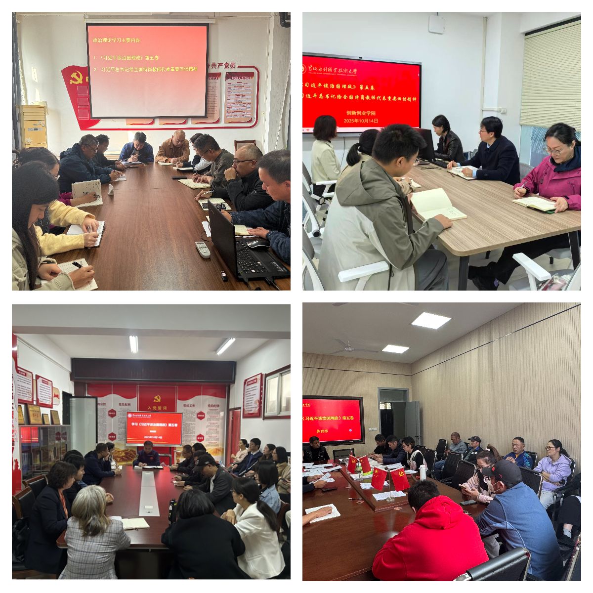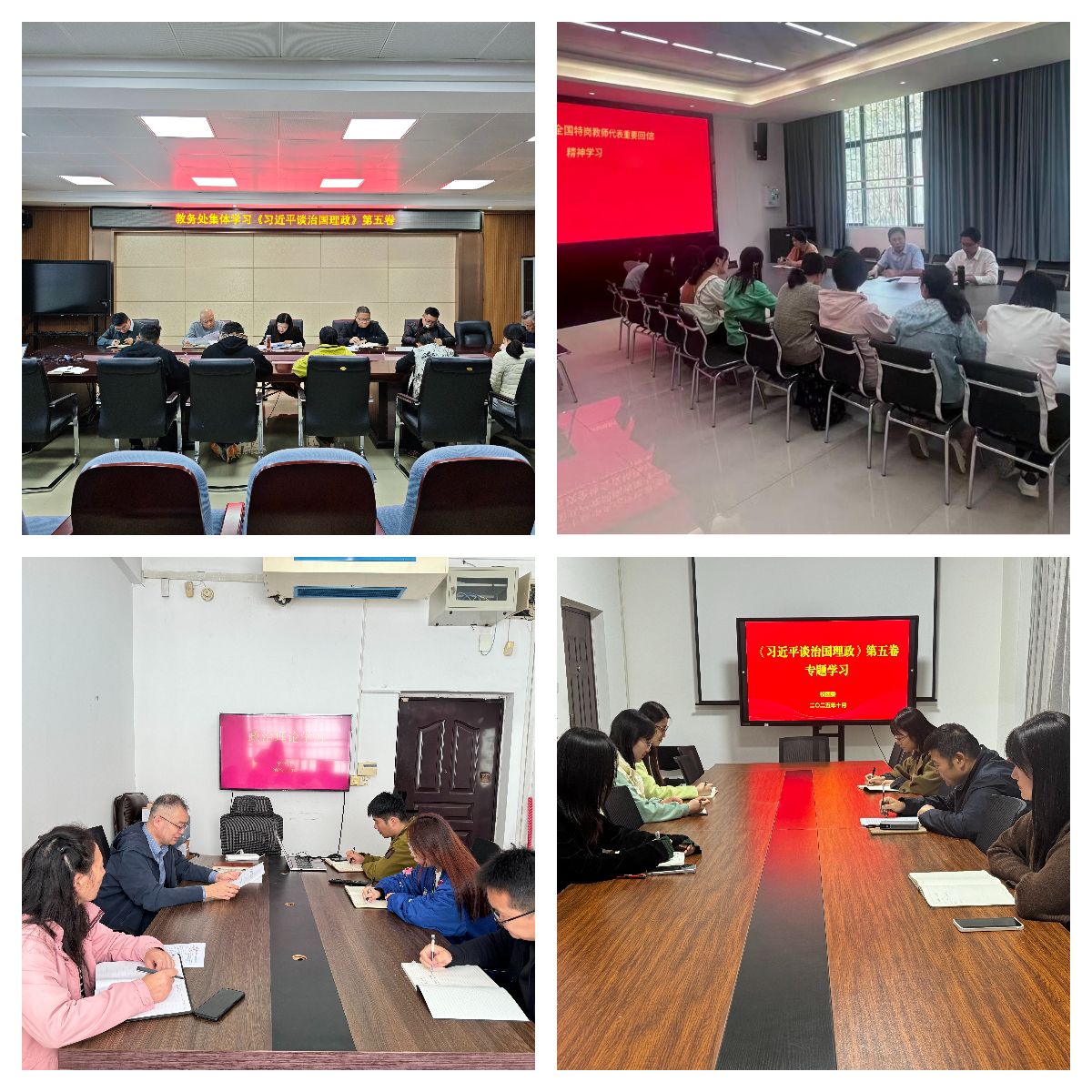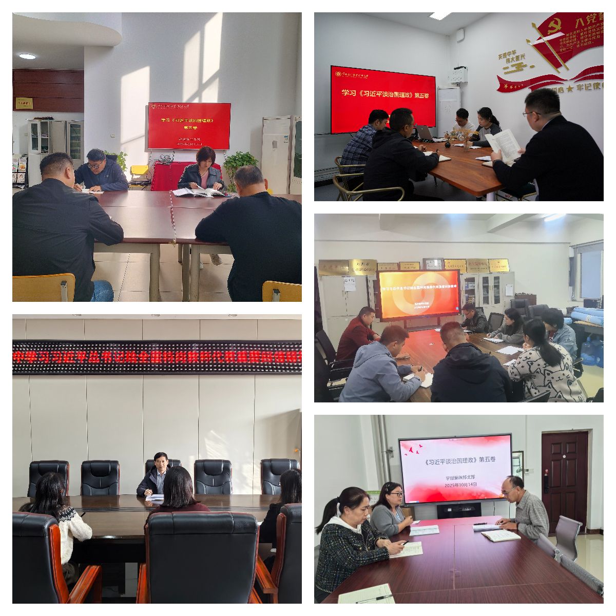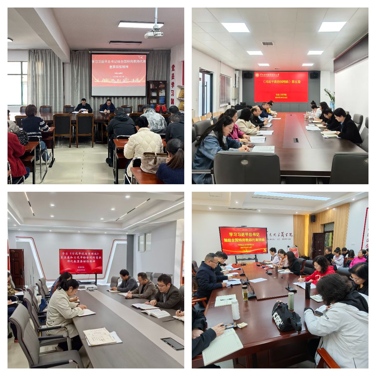 为持续深入学习贯彻习近平新时代中国特色社会主义思想,进一步贯彻落实习近平总书记关于教育的重要论述精神,10月14日,全校各部门、各单位分别组织教职工传达学习《习近平谈治国理政》第五卷和习近平总书记给全国特岗教师代表重要回信精神,增强对党的创新理论的政治认同、思想认同、理论认同、情感认同,引导全体教职工始终在思想上政治上行动上同以习近平同志为核心的党中央保持高度一致。(供图:各相关部门)