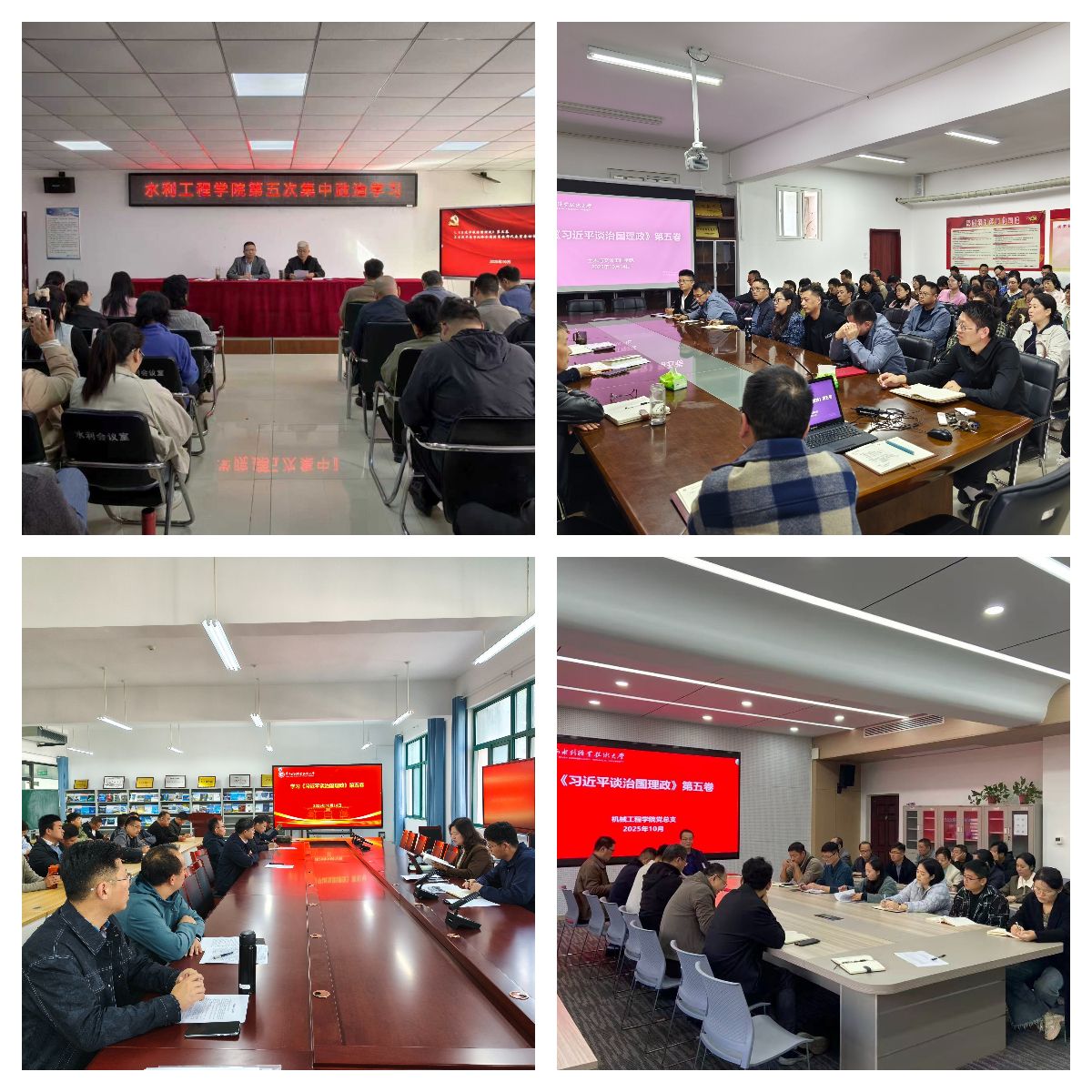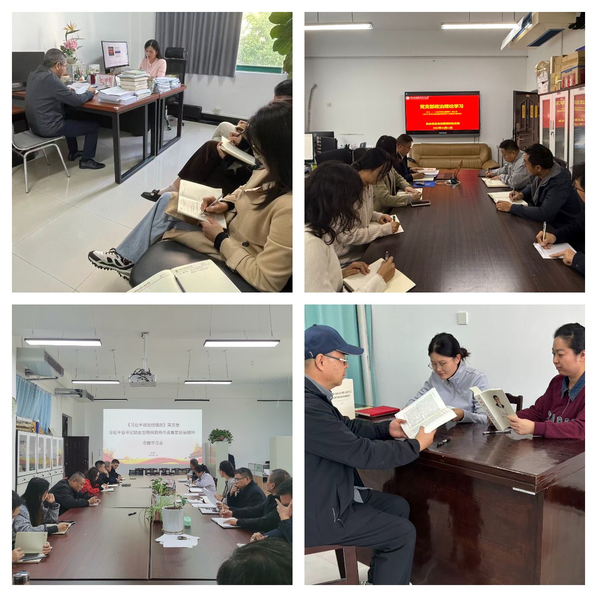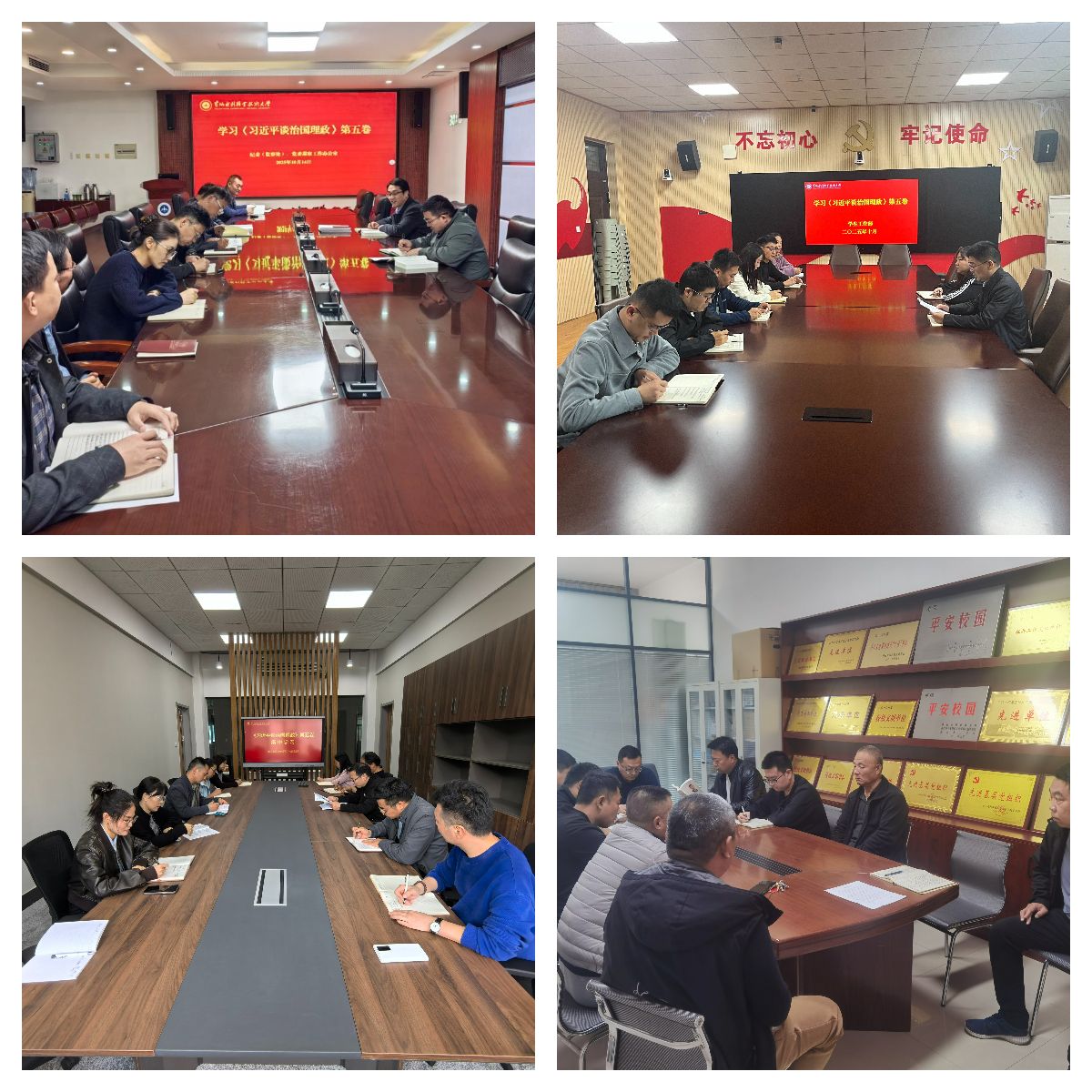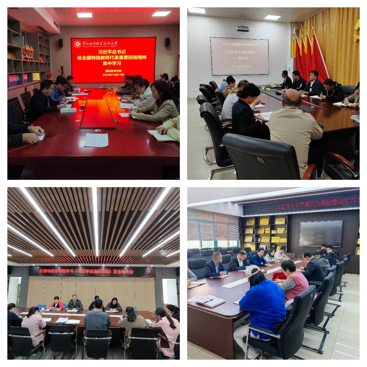 为持续深入学习贯彻习近平新时代中国特色社会主义思想,进一步贯彻落实习近平总书记关于教育的重要论述精神,10月14日,全校各部门、各单位分别组织教职工传达学习《习近平谈治国理政》第五卷和习近平总书记给全国特岗教师代表重要回信精神,增强对党的创新理论的政治认同、思想认同、理论认同、情感认同,引导全体教职工始终在思想上政治上行动上同以习近平同志为核心的党中央保持高度一致。(供图:各相关部门)