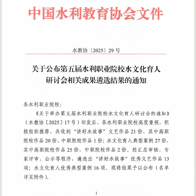 此次研讨会的召开,为水利职业院校搭建了交流合作的平台,对于推动水文化育人工作的深入开展、提升水利职业教育质量具有重要意义。我校将以此次获奖为契机,进一步深化水文化育人实践,不断探索“黄河文化+教育”的新模式,为培养更多高素质水利技术技能人才贡献力量。