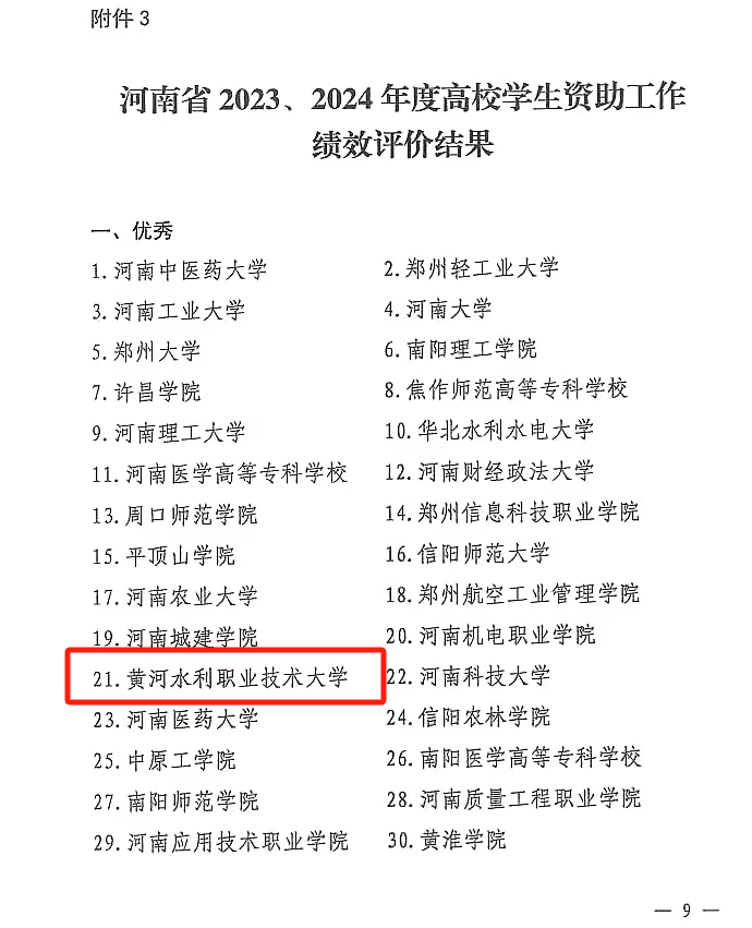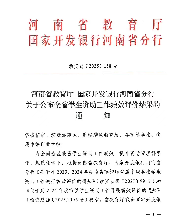 为全面检验全省学生资助工作成效,提升资助管理科学化、规范化水平,省教育厅联合国家开发银行河南省分行组织开展了2023、2024年度全省高校、省属中职必赢biying(中国)以及2024年度市县学生资助工作绩效评价。本次绩效评价通过单位自评、材料审核、问卷调查、实地复核等方式进行,于近日发布了评价结果,我校凭借优异的工作实绩、显著的育人成效和突出的创新案例,在全省高校中脱颖而出,再次获评“优秀”。
