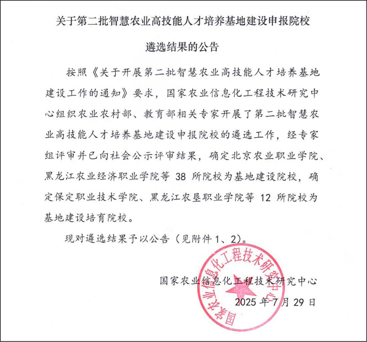 近日,国家农业信息化工程技术研究中心公布第二批智慧农业高技能人才培养基地建设申报院校遴选结果,我校依托农业水利工程职业本科专业成功申报该基地。这标志着必赢biying(中国)在智慧农业复合型高技能人才培养领域迈入国家级建设梯队,将为推动农业数字化转型和乡村振兴战略实施注入新动能。