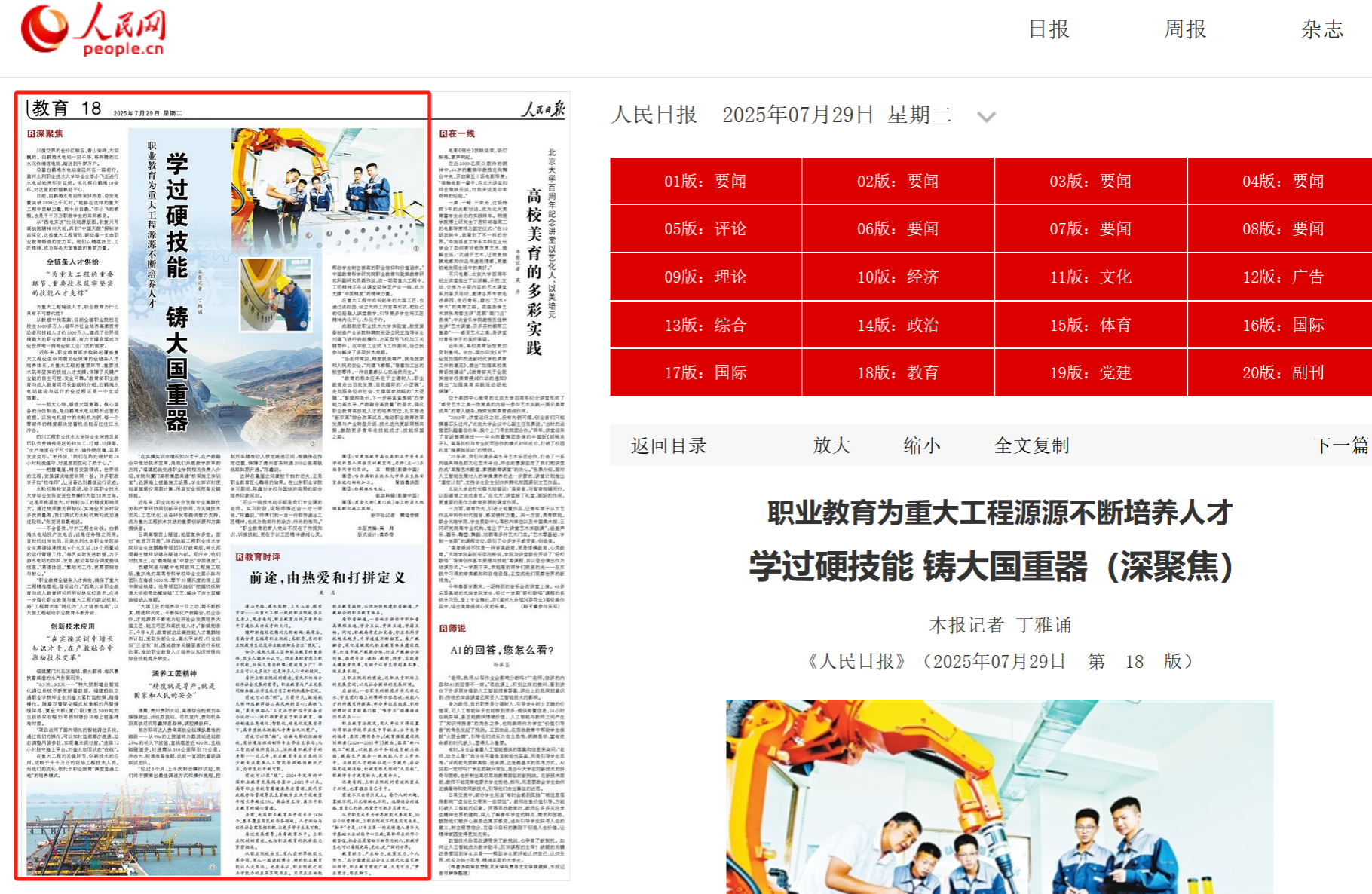 7月29日,《人民日报》教育版以“职业教育为重大工程源源不断培养人才 学过硬技能 铸大国重器”为题,展示了职业教育服务地方经济发展的生动图景,被新华网、教育部门户网站、微言教育等转载。报道以黄河水利职业技术大学毕业生服务白鹤滩水电站为切入点,深度聚焦职业院校人才培养,解读职业教育服务经济社会、支撑国家战略的“大逻辑”。