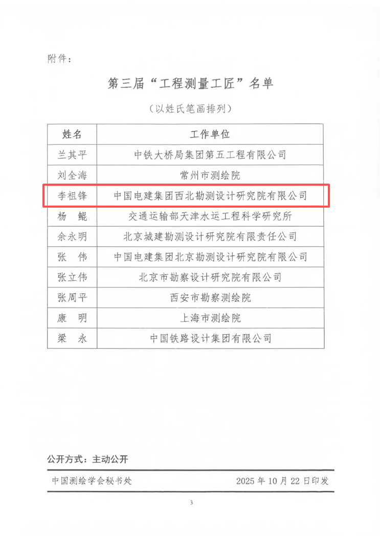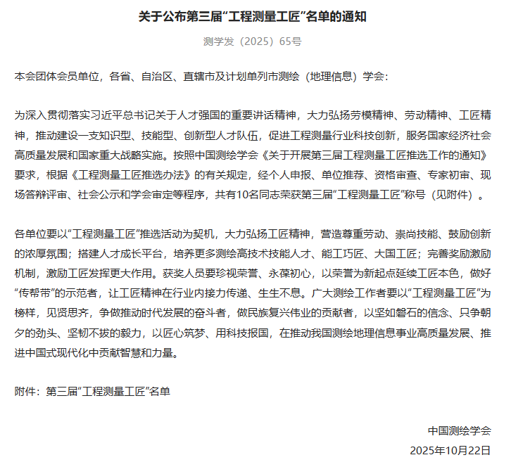 近日,中国测绘学会发布《关于公布第三届“工程测量工匠”名单的通知》(测学发〔2025〕65号),我校测绘工程必赢官方网站工程测量专业优秀毕业生李祖锋荣获第三届“工程测量工匠”称号。