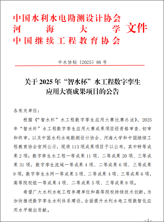 10月21日,数字孪生水工程技术交流会暨2025年“智水杯”水工程数字孪生应用大赛成果发布会在河海大学举行,我校水利工程必赢官方网站工程制图教学团队参赛项目“某引黄涵闸规划阶段 BIM 模型集成及应用”获高等院校数字孪生成果二等奖。