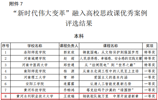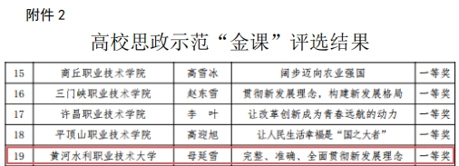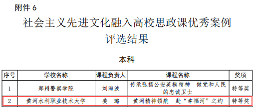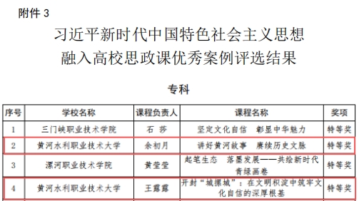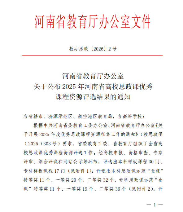 近日,河南省教育厅办公室下发《河南省教育厅办公室关于公布2025年河南省高校思政课优秀课程资源评选结果的通知》(教办思政〔2026〕2 号),我校组织思政课教师申报的课程资源再创佳绩,其中《习近平新时代中国特色社会主义思想融入高校思政课优秀案例》获特等奖2项,《社会主义先进文化融入高校思政课优秀案例》获特等奖1项,《高校思政示范“金课”》获一等奖1项,《“新时代伟大变革”融入高校思政课优秀案例》获一等奖1项。