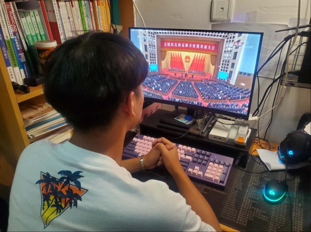 城市水利1901班谭轲仁说,在这次全国疫情表彰大会中,每一位获奖者和习近平总书记的发言,都再次展示了在疫情面前全国人民众志成城、团结奋战、共克时艰的生动画面,都把我的思绪带入那不平凡的8个月。武汉告急,全国的医疗力量向武汉挺进,全国人民在党中央的号召下戴口罩、少出门、不聚会,共同抗击疫情。每一个医务工作者和病人都是战士,每个人都度过一生中极其不平凡的一段岁月。在这次表彰大会中,党中央向全国人民发出了再启程的号召,让我们看到中国共产党不放弃、不退缩、不止步的坚强领导力,令人振奋!全国人民必将在党中央的坚强领导下齐力同心锐意进取,在全面建成小康社会、社会主义现代化国家的新征程上创造新的历史辉煌!